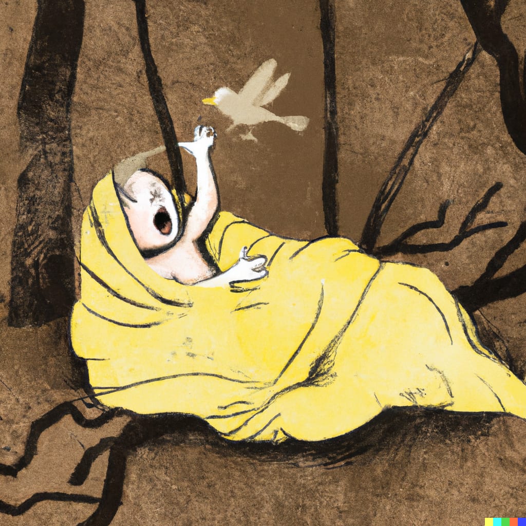 Weighed down with a moss blanket, she secured the babe in her makeshift basket