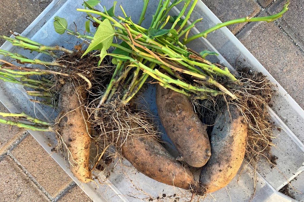 home-grown sweet potatoes.