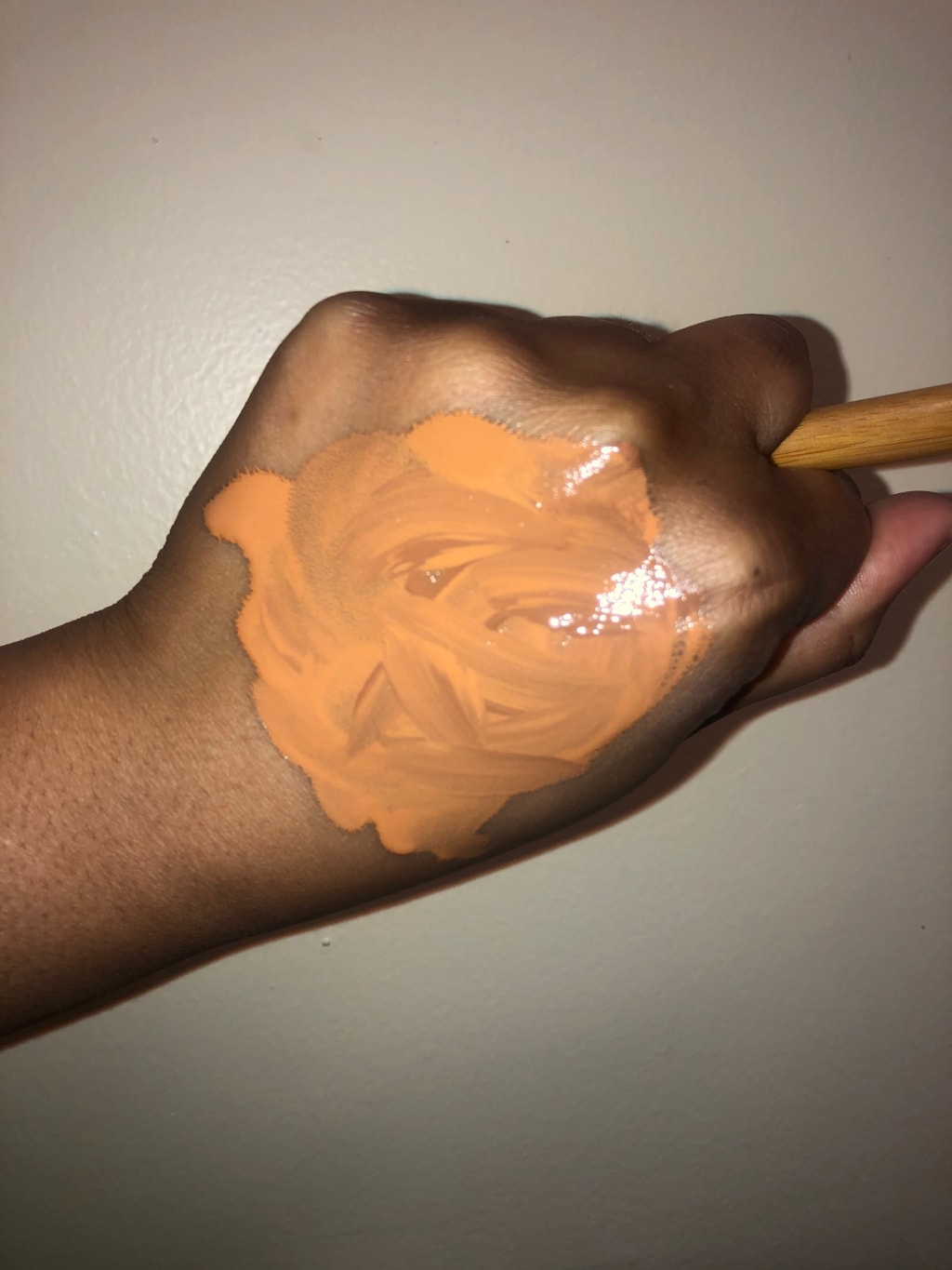 Dressed in all black, she pops the cap off the little frosted glass vial. This one is NC45, she says. She dips in her brush. I offer up my cheek.
