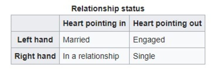 - Left ring finger with the point of the heart toward the fingertips: the wearer is engaged.