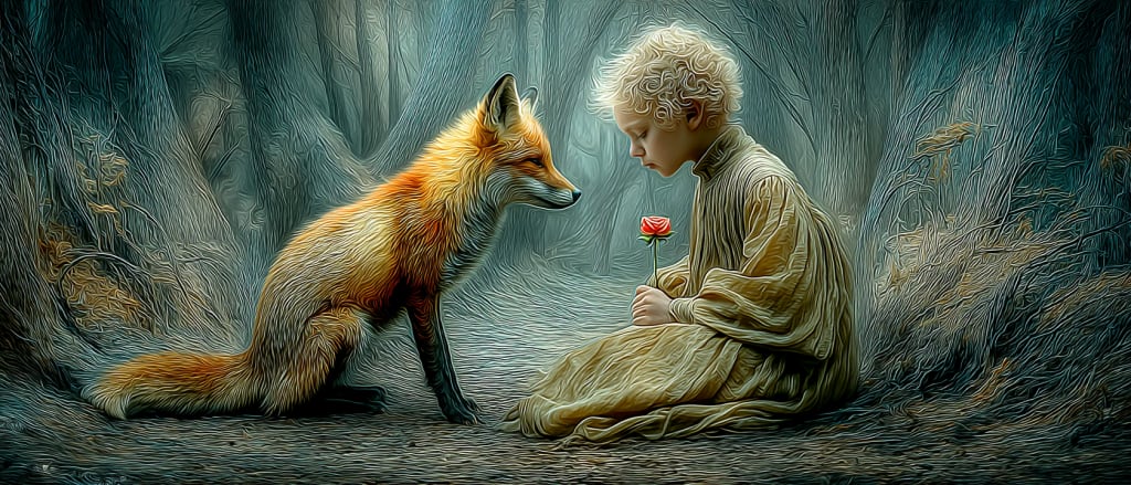 The child’s fingers, pale as moonlight, trace the rose’s edge,