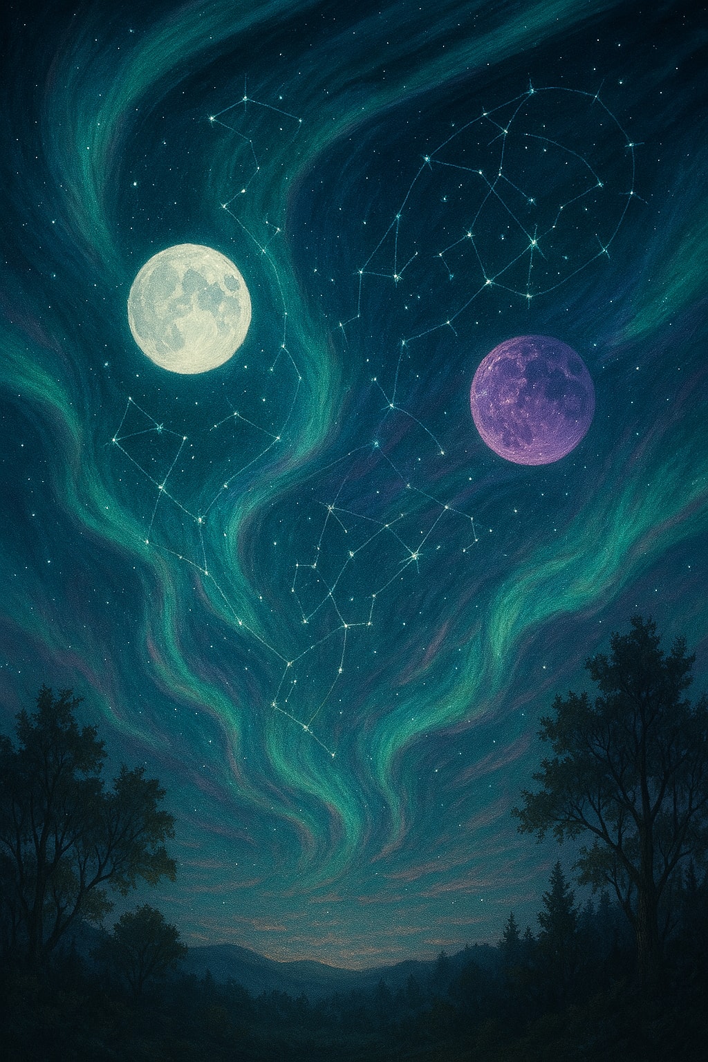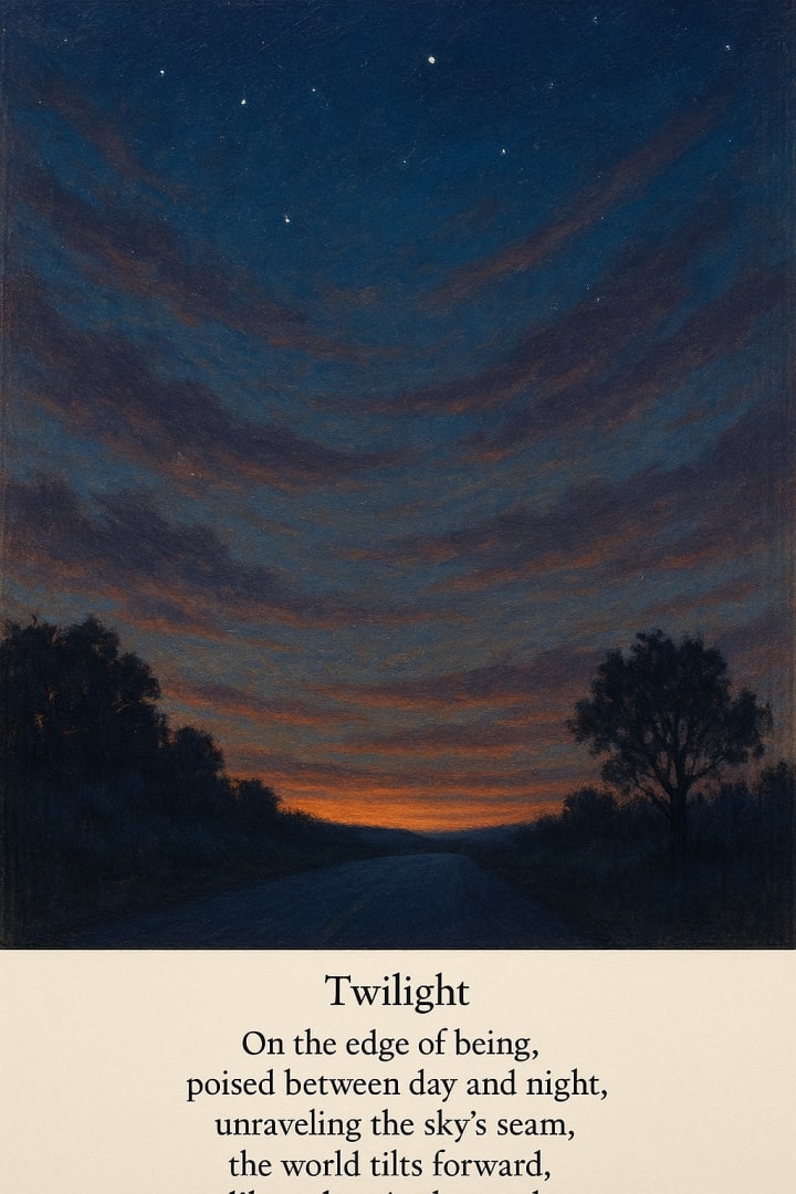 Trees lean in slightly, curious...caught in the subtle, poignant pause before night falls.