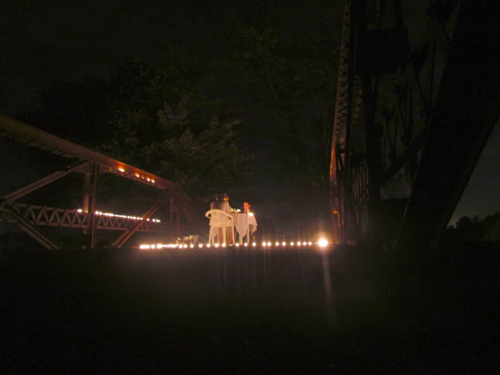 a bridge with lit candles seems to hover,