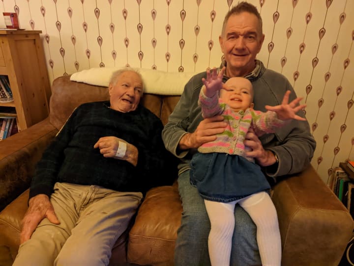 Just over a year ago my dad came up to visit us and his great-granddaughter Alexis Leia. We were going out for a meal and he fell and managed to shatter his knee. Below is a picture of him, me and Alexis-Leia while waiting for the ambulance.