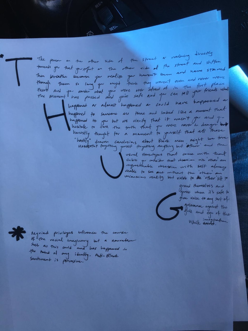 I, also a mid-twenty-something at the time, had no idea how to handle this, so I quietly excused myself and sat in the bathroom. Long enough for them to think something was wrong. I scribbled some thoughts in my notebook, primarily kicking myself for not saying anything in the moment, lamenting how it was surely too late to go back and say something now. I went home later that night/morning and wrote this piece as a stream-of-consciousness, venting the fury I felt at myself for not having defended my home and all of its beloved inhabitants.