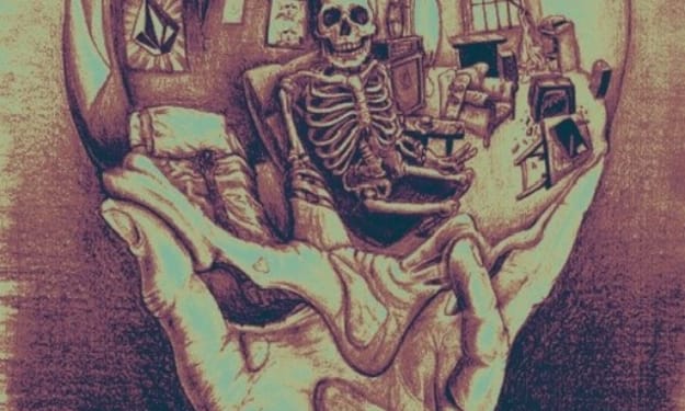 The only door out began at a slow, wide curve and ended in the sky with a receding thin shape. The only window reflected the inside darkness, and revealed the origins into the night. Very little light shined from the chandelier unto its concealed and hurting head, which had been wrapped in a dark silk cloth. The chemicals began to take effect and It finally passed out on its bed, curled tightly and with a pillow cautiously cradled over Its head; It began to dream...