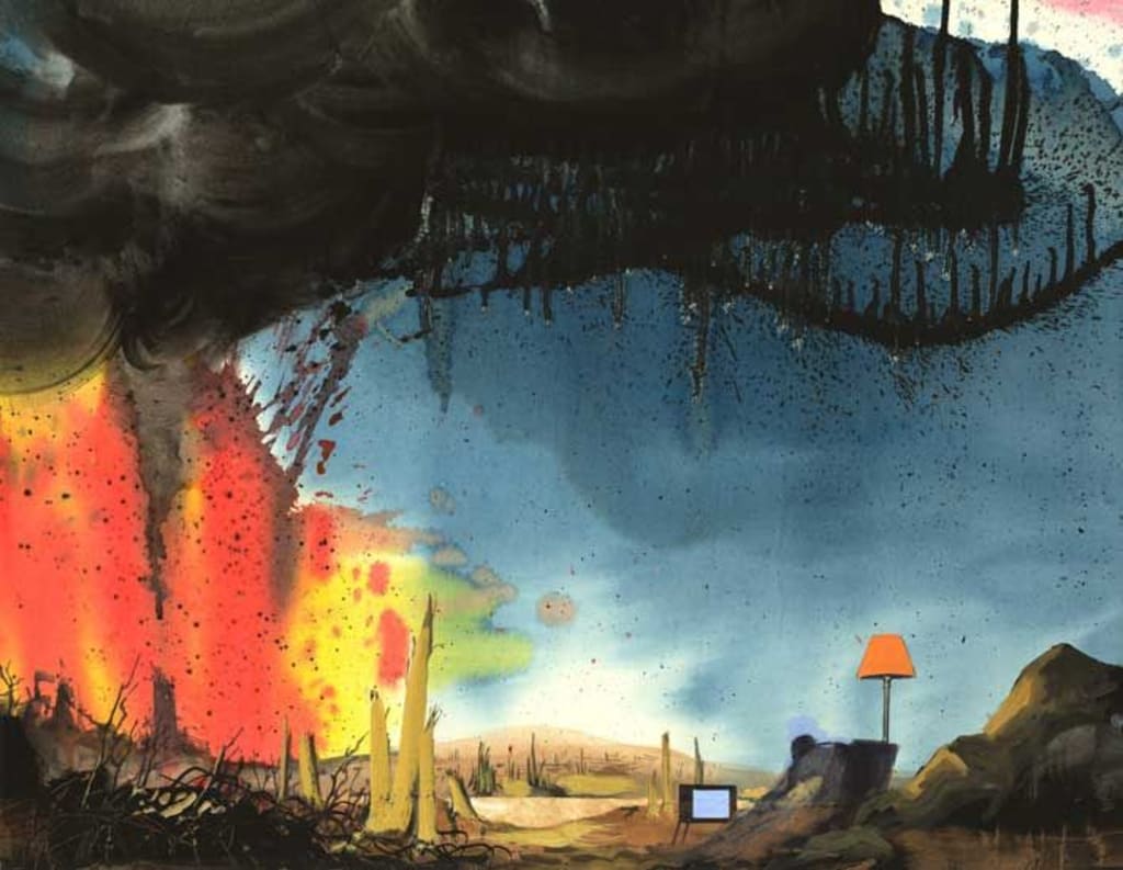 An ominous wind picked up from their screams. After seeing red flashes of mechanical light through every solid object, It covered It's eyes with a clap, as excruciatingly loud thunder shook the walls. This covering was transparent because it could still see through that every corner of the room extended into a billowing fabric, like a great tent enduring a tornado. It crawled onto Its bed and sighed in relief at the slowing down of the wind.