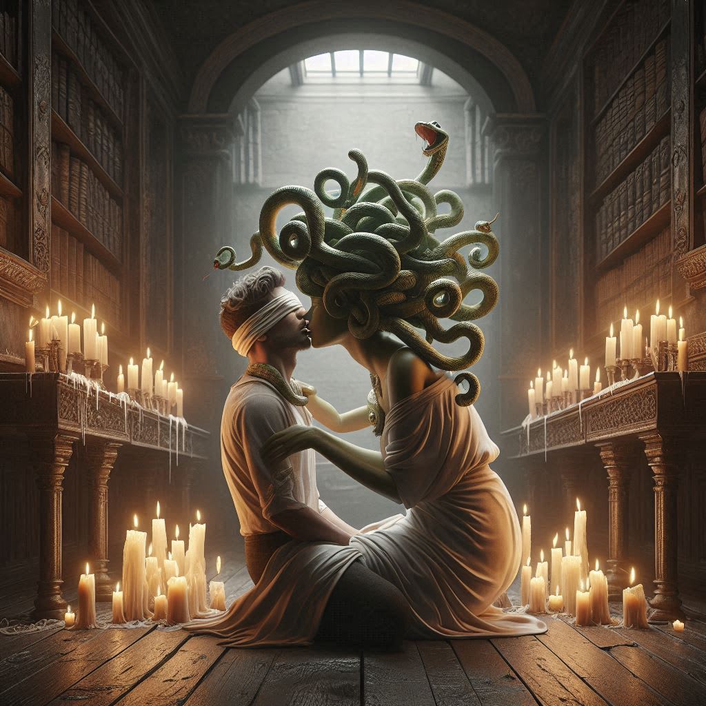 In shadows of the ruins, where beauty turned to blight, A sculpted maiden wandered, with tresses wreathed in night. Medusa, scorned by gods, with serpents for her crown, Knew only fear and silence, a terror draped in gown.