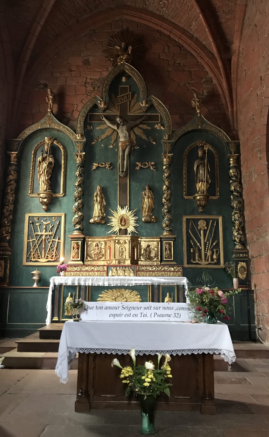 12th century church alter in France, translation is “May your loving Lord be upon us, as hope is in you.“