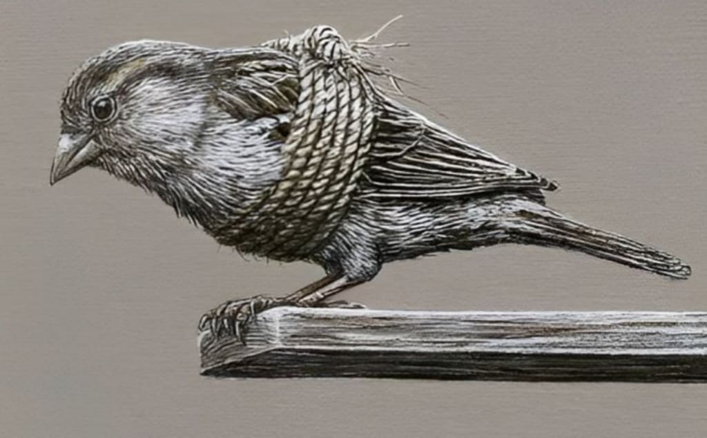 Its wings are tied by a ruthless hand,