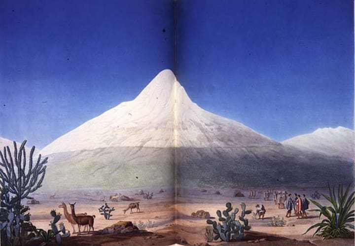 *The watercolor of the Chimborazo volcano was based on the notes of Alexander von Humboldt. It was f irst published in Alexander von Humboldt and Aimé Bonpland’s work Voyage de Humboldt et Bonpland…Ière partie; relation historique…, Paris, F. Schoell, 1810/ Public domain, via Wikimedia Commons.