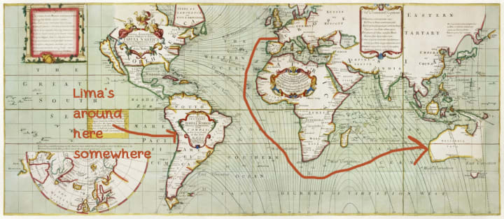 *Public domain vintage world map via Rawpixel with my scribble on it to show you even an American knows more geography than to think you sail to Peru to get from France to Australia.