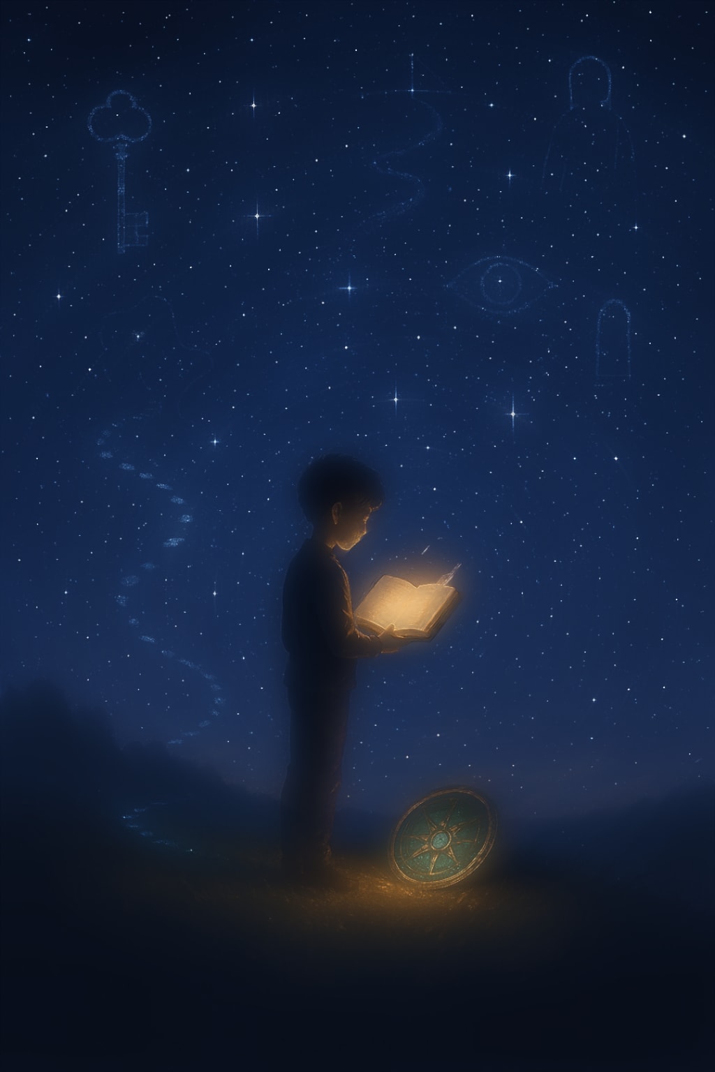 The compass spun, then stopped, and suddenly the world around him rippled like water. Trees stretched taller. The stars overhead shifted positions. The ground felt... alive. And in the distance, a path formed—a trail of soft-blue stones, glowing beneath his feet.