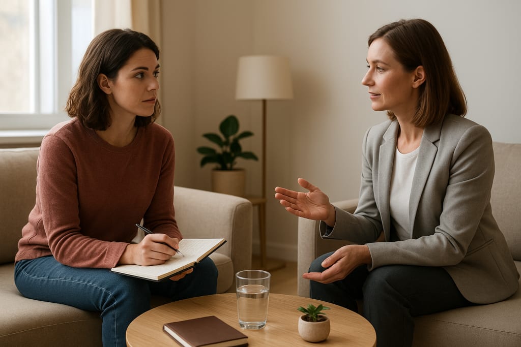 woman engaged in CBT therapy session, taking notes while therapist guides