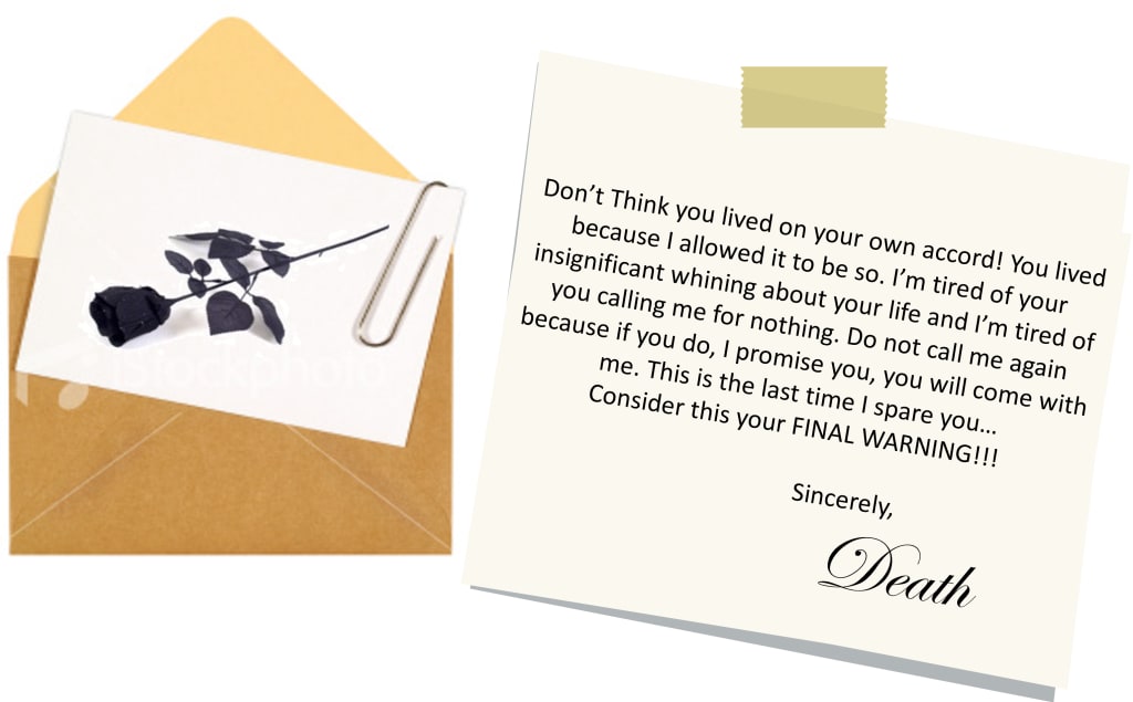 I awake in my bed. I’m safe. I’m warm. It must have been a dream. It felt all too real. I sit up. I stretch. I sigh in relief. I was happy to be here. This time. This moment. I was alive. I stepped out the room. Sat with my family. The day was good. When I got back to my room. There was a card on my dresser. It was addressed to me. I opened it. On the front of the card was a single black rose. I read the card to myself. Then out loud to the empty room. The card read: