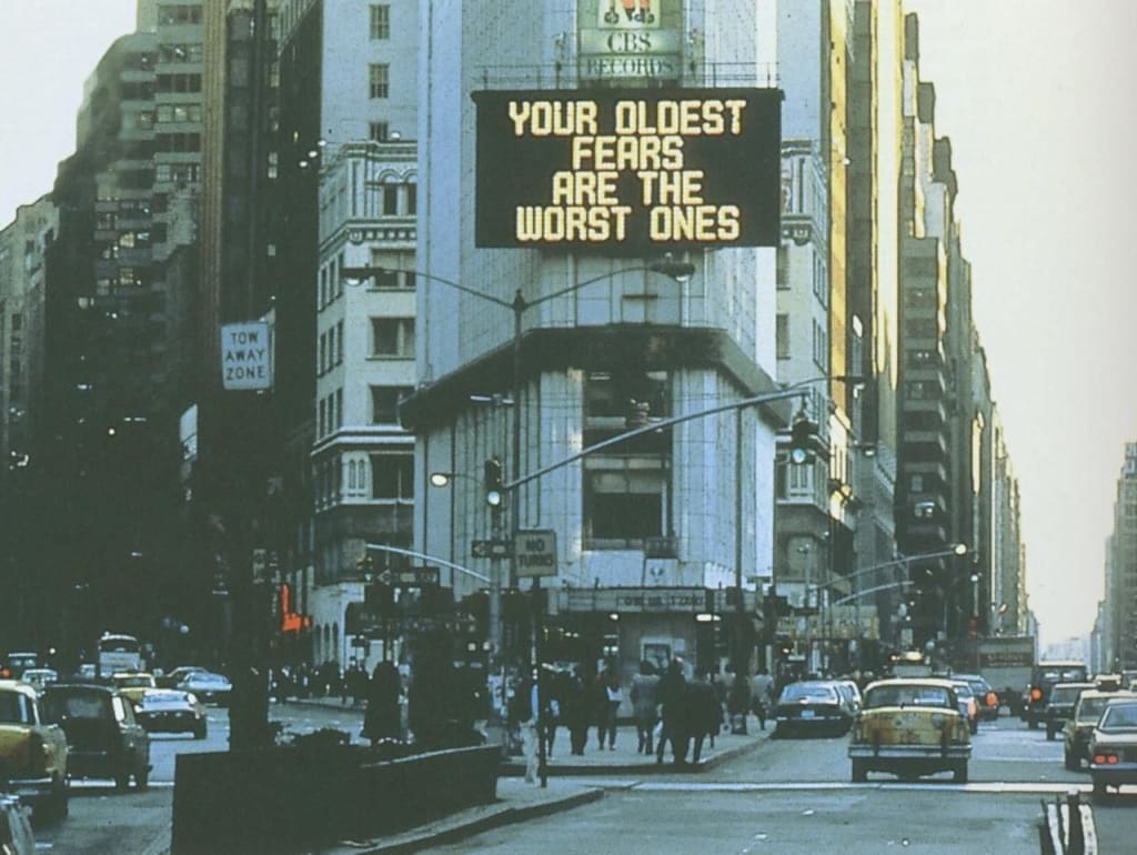 Jenny Holzter conceptualized a piece of her writing with art, it was a public art exhibit in 1982 that displayed on a billboard in New York city. On that billboard flickered in neon letters were words that said your oldest fears are the worst ones and that always stuck to me.
