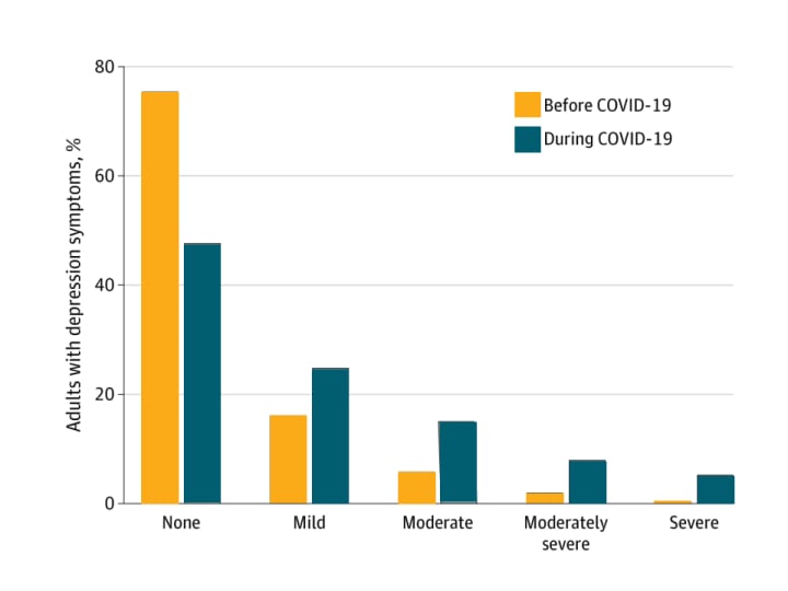 As you can see from this chart done by the CDC, the number of adults with depressive symptoms has increased in every category during Covid-19. The number of adults with mild depressive symptoms has gone over 20% and the number of adults showing no signs of depressive symptoms has gone down to roughly 45%.