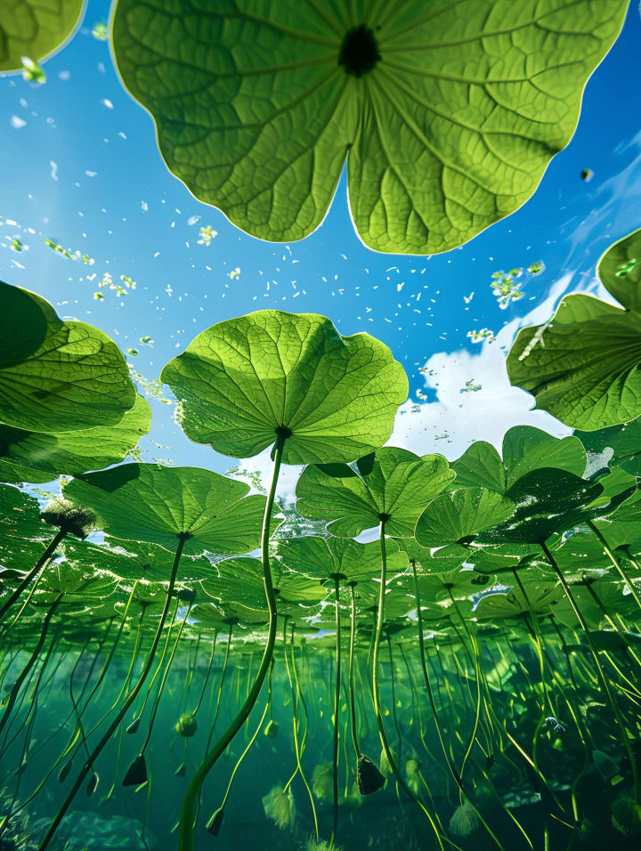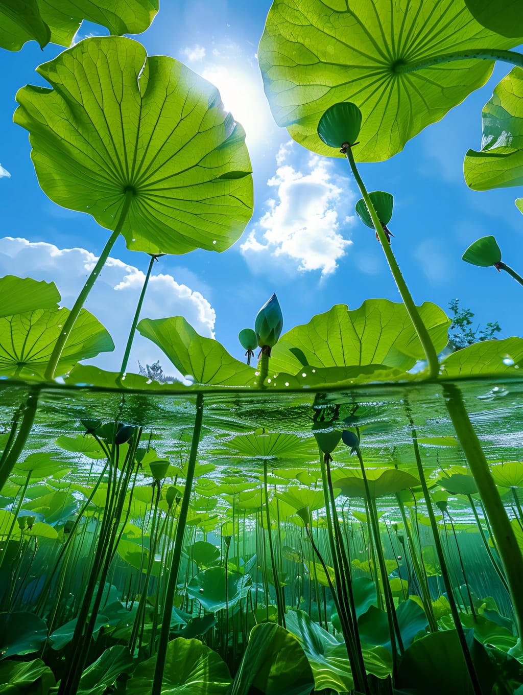 yourself submerged in a tranquil pond, surrounded by the delicate elegance of lotus blossoms and their expansive leaves. The scene above you is a mesmerizing dance of nature, a vivid tapestry of green and blue that captures the essence of serenity. This unique underwater perspective offers a rare glimpse into the beauty of a lotus pond, where the world above and below the water’s surface blend seamlessly into one harmonious entity.