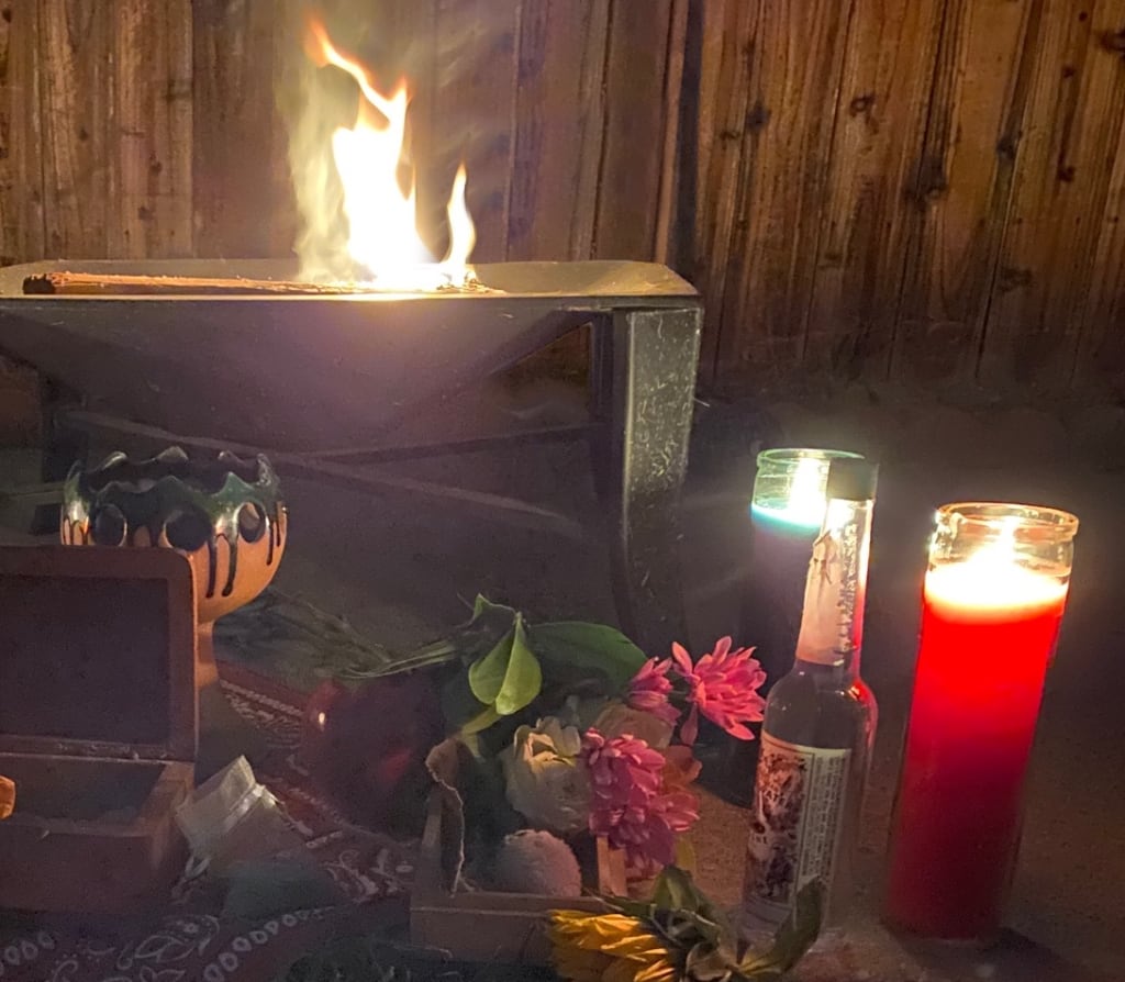 Almost startled, I feel the dancers lining up to come back in…the drummer raised his hand to me, signaling and allowing me to stay. When the drum started I felt every single beat rattle my bones, almost as if waking them up. The wind of the movement surrounding me, the dancers all moving to the left simultaneously. And then exactly synchronized to the right. I give my tobacco to the fire, lay my marigold next to the hundred others. All beautifully adorned and decorating the alter full of candles, pictures of the deceased and smoke rising up from the burning medicine. I breathed everything in, and felt both of my realities meeting. Finally, I found a place where all of me is accepted. I don’t have to walk in two different worlds and hide myself. My angels are a huge part of me, never will I forget and never will I hide myself or them again.