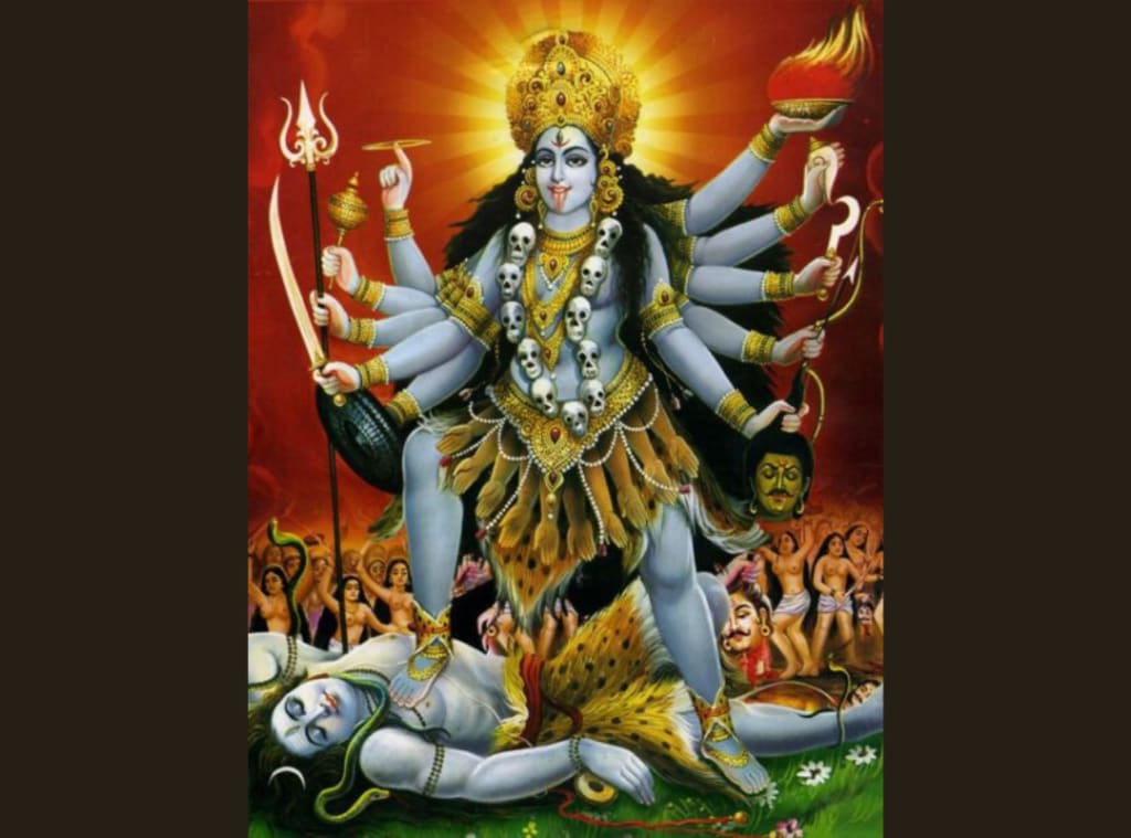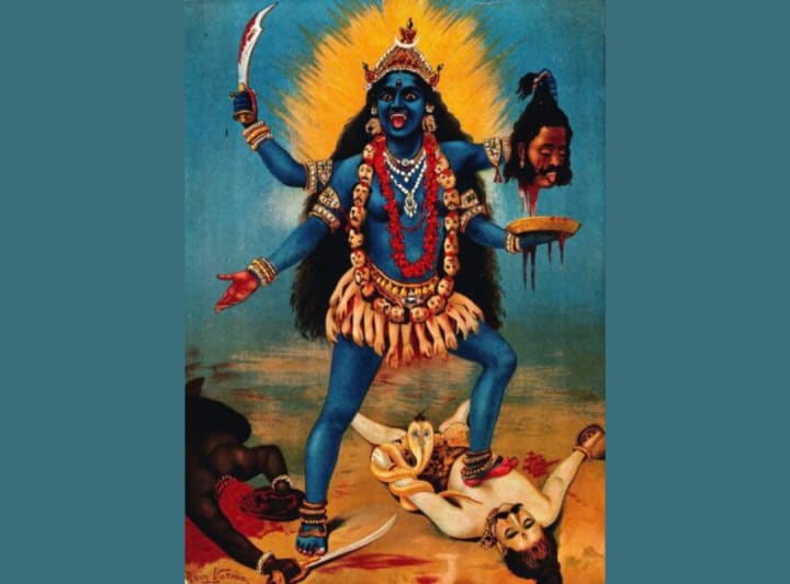 Goddess Kali is one of the many different aspects of Parvati, the manifestation of Shakti, which is said to be the primordial cosmic energy and the dynamic forces that move throughout the Universe. Often described as feminine energy and power, Shakti is the personification of the creative, sustaining, and destructive forces. Kali appears for the first time in early Upanishad literature around 500 BCE when words like karma and moksha began to grow with Buddhism, which rejected the materialistic obsession with society. Kali is born from the locks of Shiva's hair along with her brother Virabhatra. She stands on top of Shiva, but together they invoke violence, sexuality, and an indifference to social disapproval.