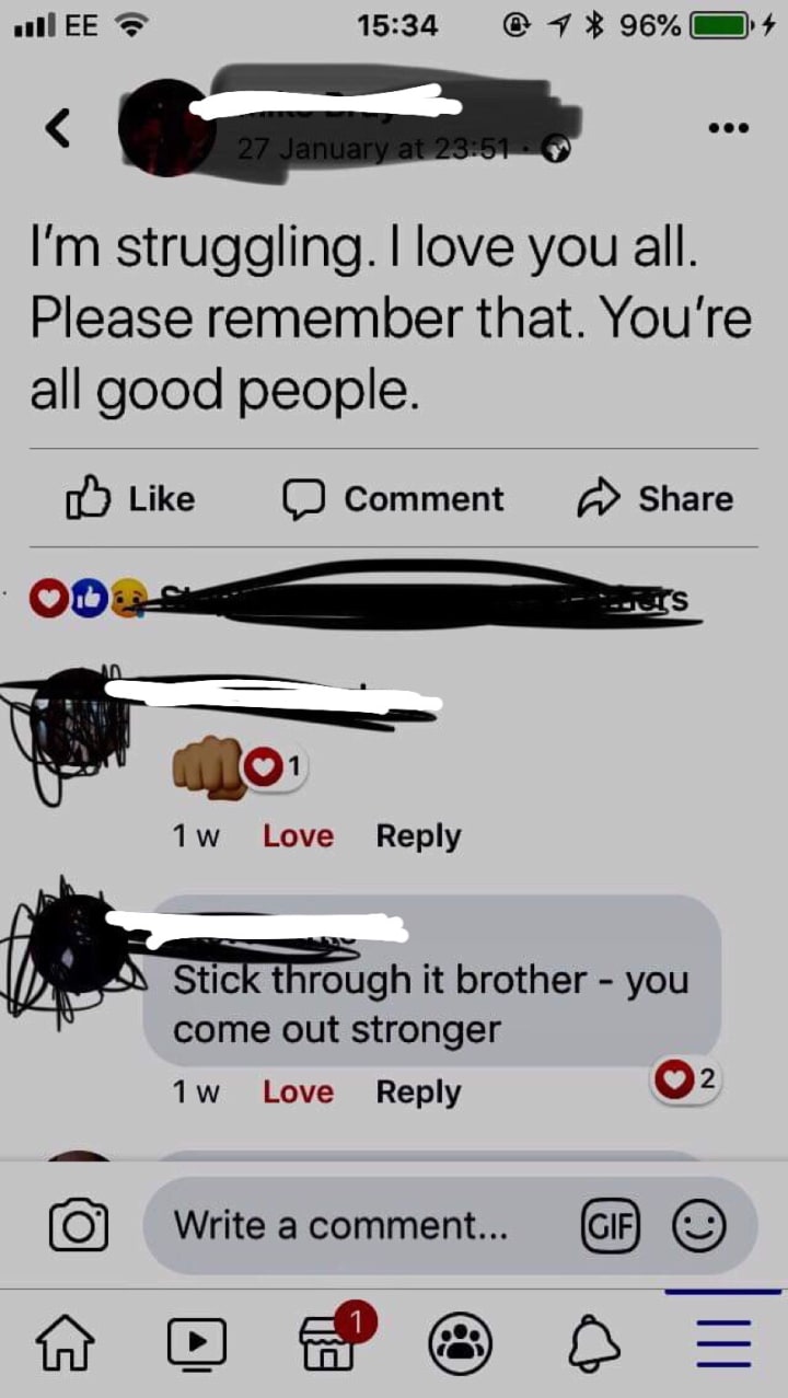 Over the past few months, I’ve had a couple of minor episodes where I’ve not completely been myself, but nothing too serious, just a day off work, or cancelling plans last minute, looking for reasons not to go out. It didn’t seem all that troubling, however, it’s now clear that something more was building. I was struggling a lot more than anyone could have guessed, and as I didn’t reach out, nobody ever would have guessed.