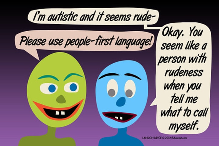 Sequenzia, A. (2017, July). The Failings of Person First Language. [Web log post]. Retrieved from: https://autismwomensnetwork.org/failings-person-first-language