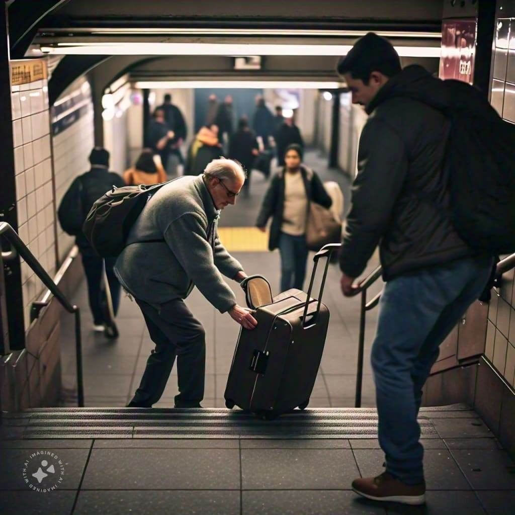 He tried repeatedly to maneuver the suitcase up the stairs, but it seemed almost too much for him. The subway station was crowded, and most people hurried past, lost in their own worlds. Seeing his struggle, I felt a pang of sympathy. My instinct was to offer help, but the busy pace of the morning made me hesitate. Still, the image of his struggle lingered in my mind.