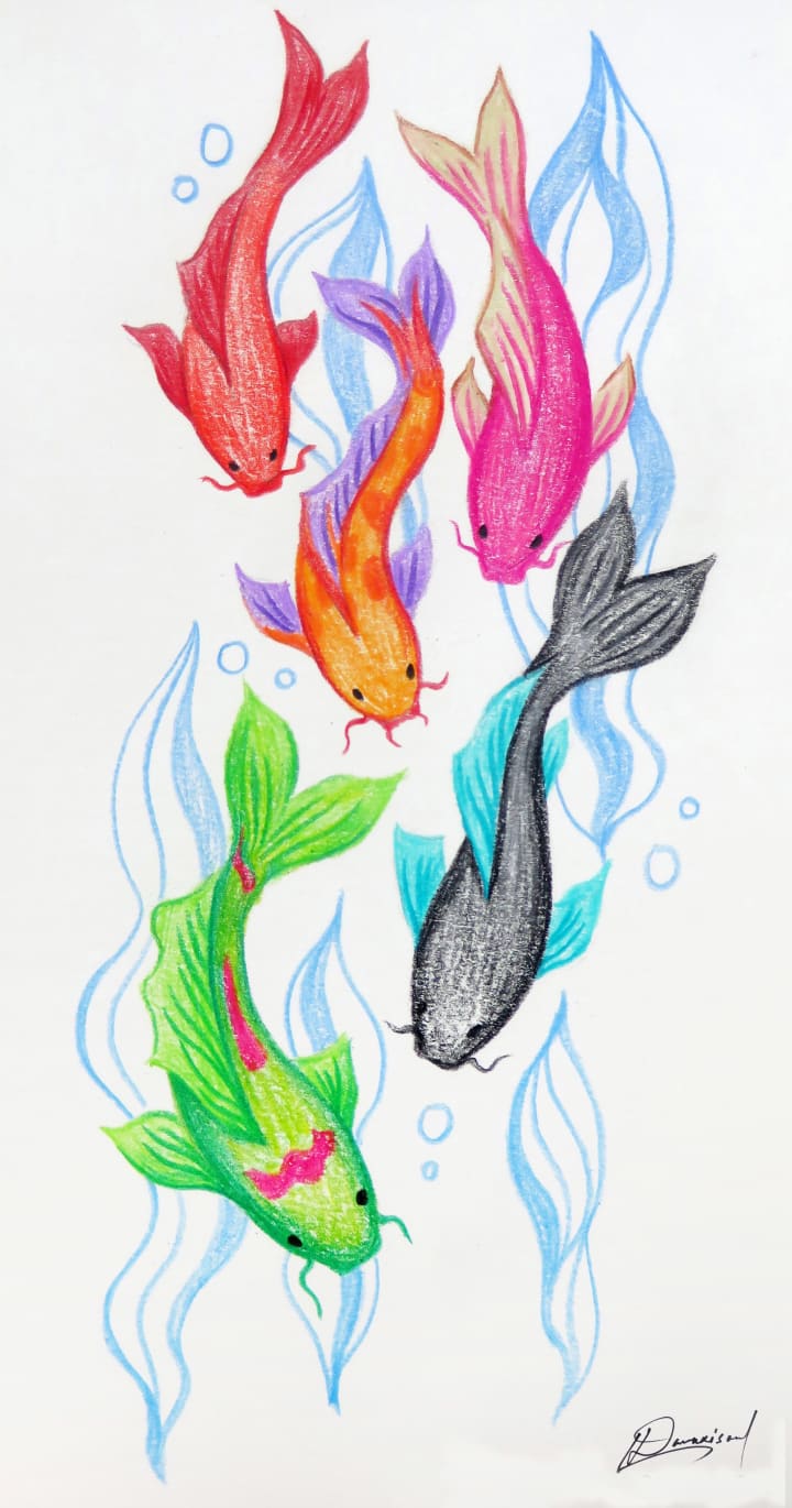 Love is the softest and most vulnerable part of our hearts. Five koi fishes are telling us that true love is not the impulse of passion, sweet love warms our daily life. When we are seen, heard, and cared for by our partners, love exists. When we share and participate in a lively, open, and new life, love will flourish. When we look at things from each other's perspectives, love will ignite a flame. Only after experiencing, we can know how wonderful love is, what we have experienced, and what we have missed.