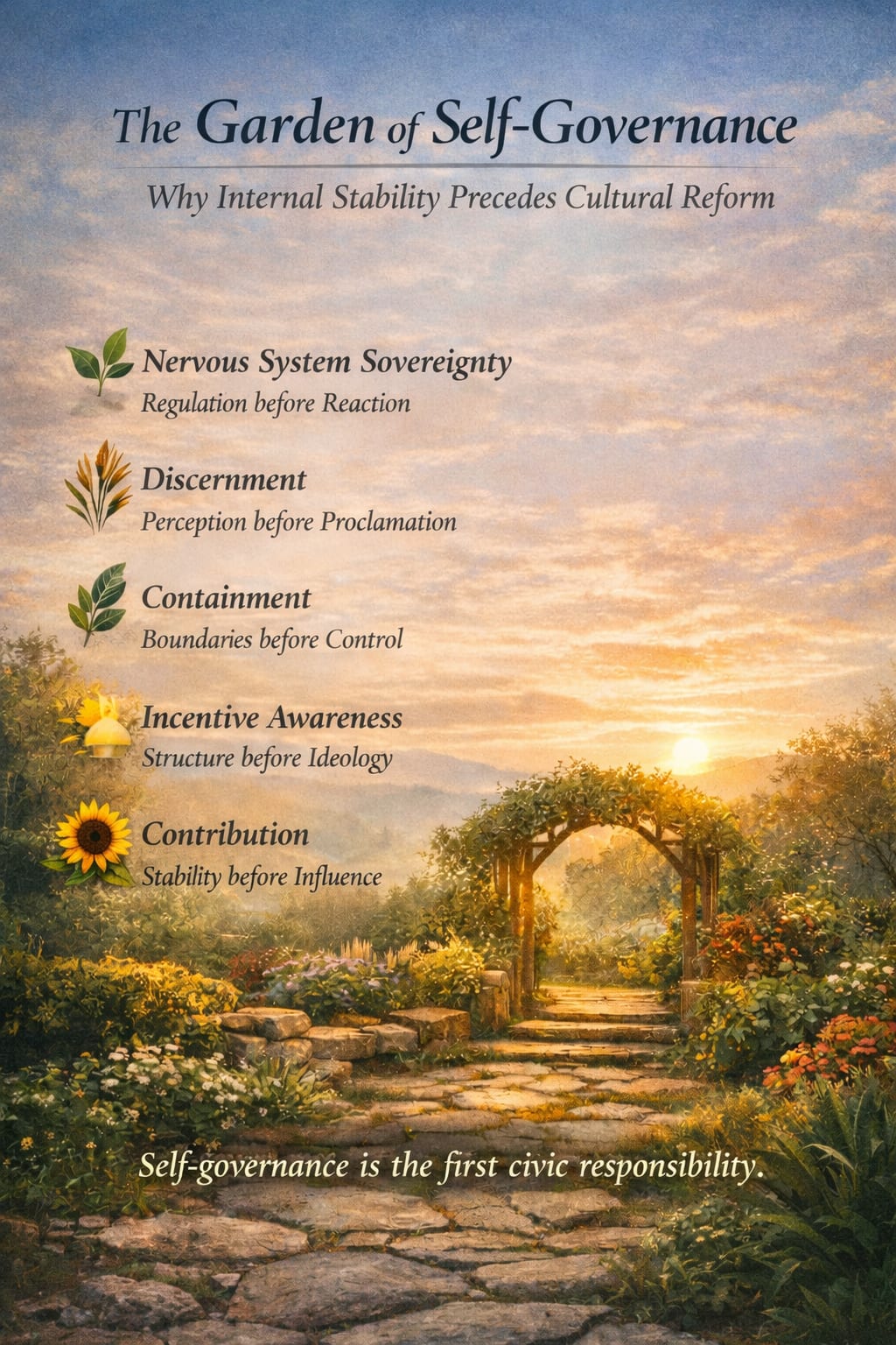 LOVE THIS > ๐ŸŒฑ The Root System โ€” Nervous System Sovereignty ๐ŸŒพ The Soil โ€” Discernment ๐ŸŒฟ The Boundaries โ€” Containment ๐ŸŒฆ The Climate โ€” Incentive Awareness ๐ŸŒป The Harvest โ€” Contribution