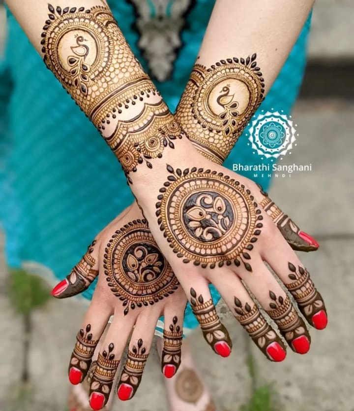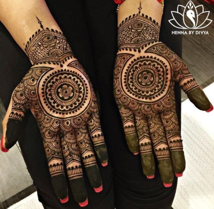 This beautiful mehndi has a large circular pattern in the middle of the rear hand. There are adequate white areas on the fingertips and the ideal combination of symmetrical designs.