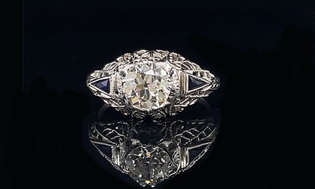 Early Art Deco diamond engagement rings and jewelry were decorative and fancy in style with filigree which was often accented with synthetic sapphires or natural emeralds. Price was not a consideration when creating jewelry. Cocktail rings were in vogue. This was a time of high fashion and elegant style. Cocktail parties were the rage and everyone was trying to gracefully out do the other.