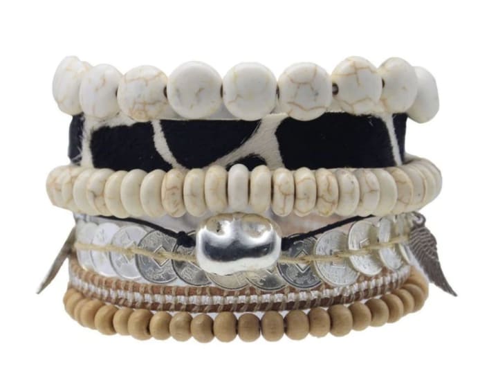 The tribal twist Loisaba Cuff by Freya Branwyn is a perfect example of mixing and matching in bohemian fashion. The bracelet combines traditional gypsy style silver coins, natural Howlite stone beads, and delicate wing charms with a modern white gold plated stainless steel magnetic clasp. The use of different materials, textures, and finishes creates a dynamic and visually interesting piece that can be paired with a variety of outfits.