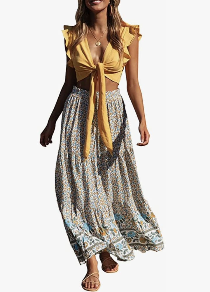 This Boho Floral Printed Maxi Skirt shown features a boho style, vintage floral print, and high-waisted A-line and pleated design, is a perfect example of mixing and matching in bohemian fashion. The skirt is made from a blend of 95% Rayon and 5% Spandex, which gives it a comfortable and stretchy feel. It comes in four different sizes and can be worn as a Maxi length or Midi length, depending on the wearer's height and the size purchased.