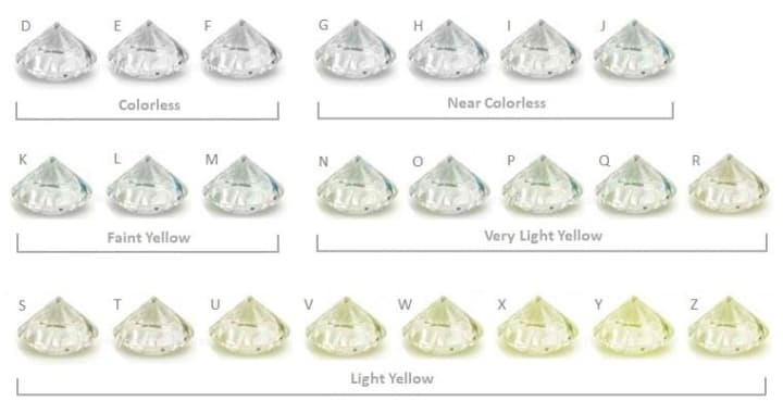 The most Colorless diamonds are called "D Color," and as the Color (Normally Yellow) increases, they are graded from E to F to G to H to I to J... and finally to Z, making up a total of 23 grades.