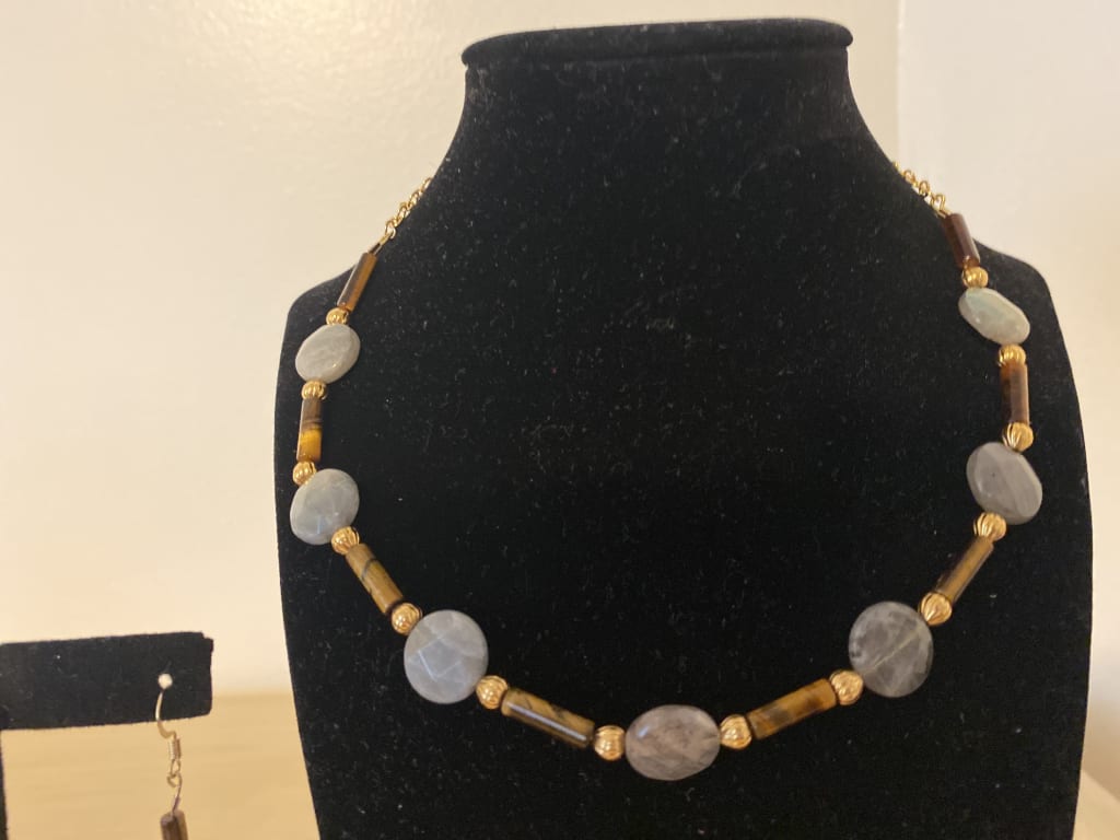 Labradorite and tiger eye coupled with decorative brass beads. The energies of the stones work well together. Labradorite creates a force field preventing others from draining your energy and tiger eye can help create harmony with people who have different views. Wearing this piece can remind you of positive affirmations and it looks good too.