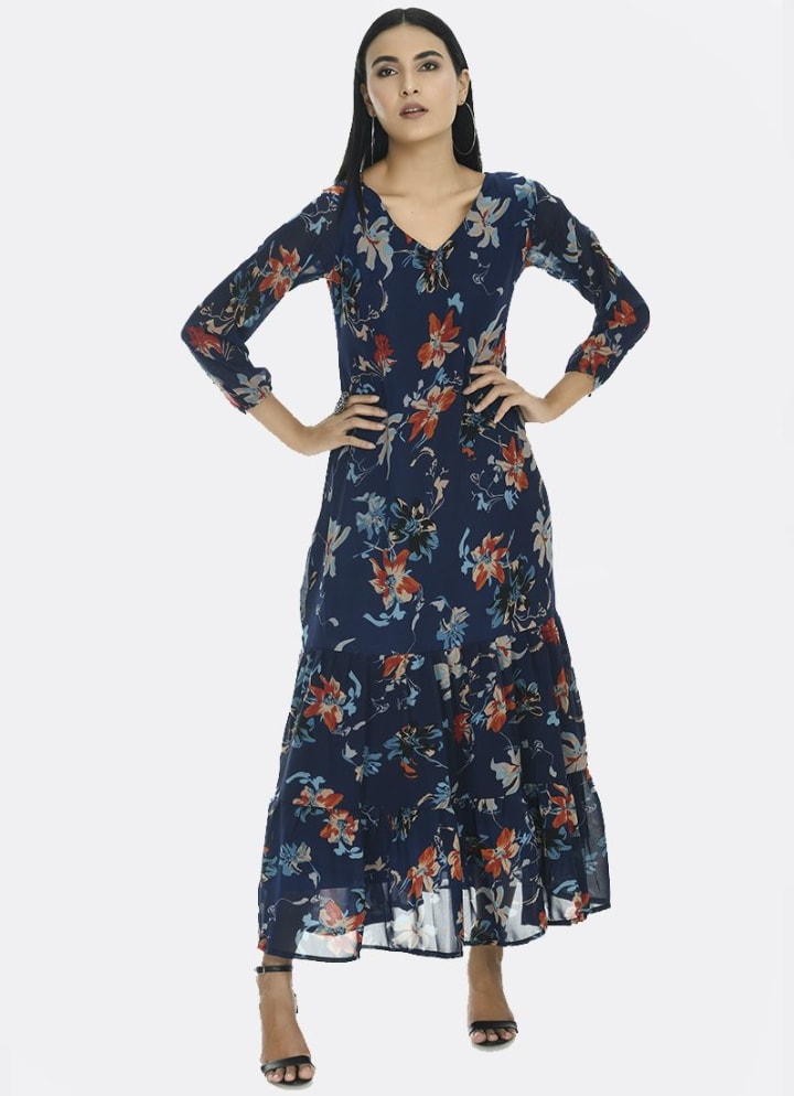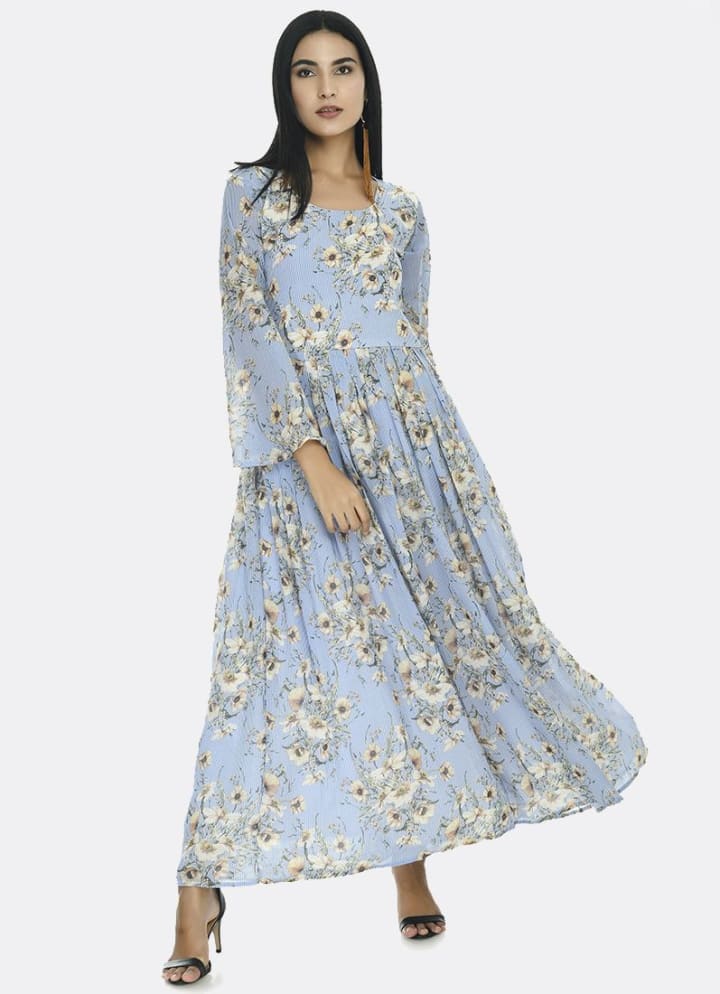 DR-423 A blue georgette long dress comes in a beautifully floral printed georgette fabric, this fit and flare dress is the summer vibe that we are looking for. Accessorize it with a dazzling necklace and a quirky sling bag, for footwear one can pair it with gladiators or wedges as well for a complete look. It represents a fresh look which one can carry off creatively if styled well according to the occasion. It's definitely a head turner so add this to your shopping list ASAP!