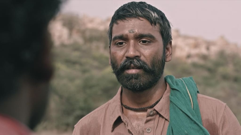 Past: The narrator reveals that the man is Sivasaami and the boy is his son Chidambaram. In contrast, the woman, man, and child are Sivasaami's wife, Pachaiyamma, her brother Murugesan and daughter Lakshmi. They also had an older son called Velmurugan. They are a family of farmers living in Thekkoor (lit. southern village). Sivasaami has a close relationship with his older son but is distant, almost abusive with Chidambaram. Sivasaami's family, along with most residents of Thekkoor, are Dalits. Narasimhan is an upper-caste landlord from Vadakoor (lit. northern village), who needs Sivasaami's 3 acres of land for a factory, to which the family is against selling, especially Velmurugan.