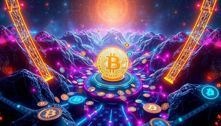 A futuristic digital landscape shows a wide range of cryptocurrency coins. A glowing Bitcoin symbol is at the center, surrounded by altcoins. The scene has intricate blockchain structures, vibrant neon colors, and dynamic light patterns.