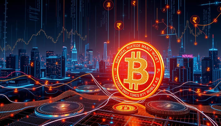 A visual representation of digital currency, featuring a large, glowing bitcoin symbol surrounded by stacks of Indian rupees, with a dynamic background of financial graphs and numbers, in a futuristic style that conveys the concept of cryptocurrency value exchange.
