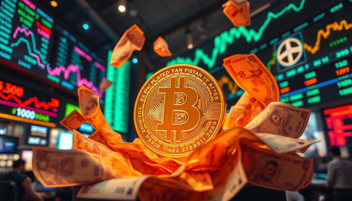 A futuristic digital landscape featuring a giant golden Bitcoin symbol surrounded by stacks of Indian Rupee notes, with an abstract representation of currency exchange, vibrant colors, and flowing data streams in the background.