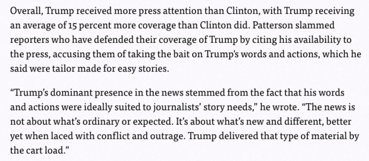 The ability to extort fifteen percent more air time than your opponent Clinton, with cruel jokes and false promises is quite impressive - You were the center of political attention. Every day seemed like a nightmare we could not escape; you were everywhere, and I mean that as invasively as possible! But, if the media wasn't completely blown away by your other tactics, you had this natural gift of contradicting yourself, forcing your wretched name to resurface. You have utilized media outlets as a mass hypnotizing device to gather groups and use them as armies of Trumpetting jerks, and it didn't take much effort. News networks made it easy for you to reach and engage the people you needed on your team. And with all of your ducks in a row, there was no way you could be defeated.