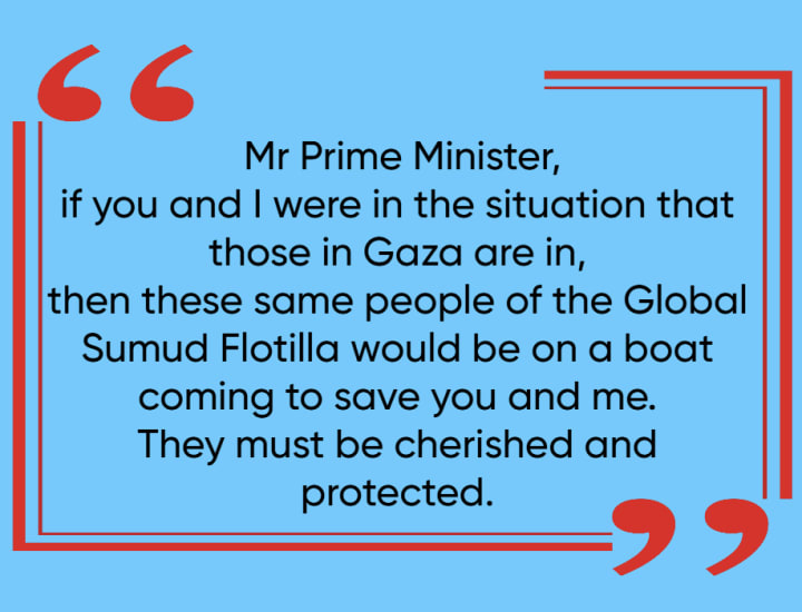 The world watched on as vital aid and humanitarians from the Global Sumud Flotilla were abducted. The world watched the heroes on the Flotilla (people who embody the finest examples of humanity), heroes risking themselves to save the lives of others, now being illegally abducted by Israel. Mr Prime Minister, if you and I were in the situation that those in Gaza are in, then these same people of the Global Sumud Flotilla would be on a boat coming to save you and me. They must be cherished and protected.