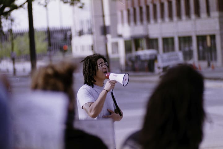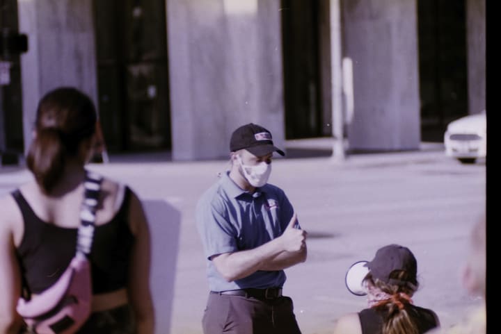 I personally dislike mainstream media photographers and reporters. I view them as soulless vultures that feast off people's misery for-profit and genuinely don't care about the people just as long as they can get the perfect shot. At the other protest, photographers had been getting into protesters' faces to get "the perfect shot" so they can sell the photos or gain clout. One cameraman had even gone as far as to step in front of me while I was taking pictures. When I confronted him, he simply shrugged his shoulders and went back to recording. It made me happy when the megaphone lady (as seen above) had told this TV reporter to fuck off. When she had asked him what his views on the BLM moment were, he said, and I quote, "I work for the media, and I am not allowed to have an opinion and have to stay neutral." She then promptly banished him to the outskirts of the protest, which could be relatable to being in "Facebook Jail." I was happy now because the media vultures wouldn't be quite literally perching on protesters to get the perfect shot.