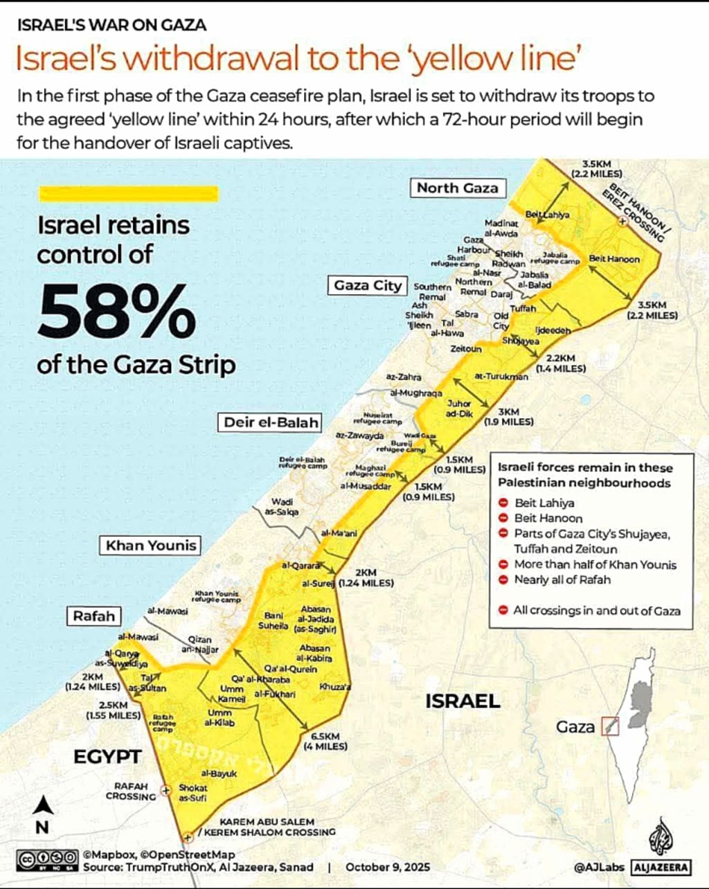 Military analysts suggest that Israel still controls roughly 58–75% of Gaza’s land area — particularly key routes and crossings such as Kerem Shalom, Rafah, and Beit Hanoun (Erez).