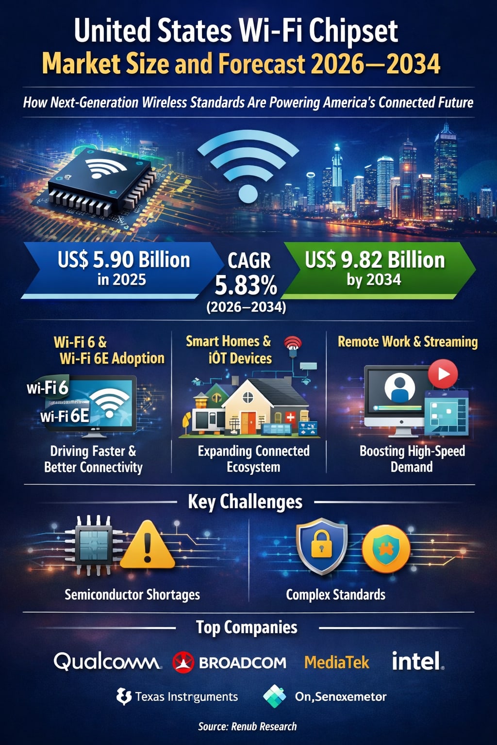 The United States Wi-Fi Chipset Market is projected to grow substantially, expanding from US$ 5.90 Billion in 2025 to US$ 9.82 Billion in 2034, registering a robust CAGR of 5.83% from 2026–2034, according to Renub Research. This sustained growth reflects the country’s accelerating demand for high-speed, reliable wireless connectivity across consumer electronics, enterprise networks, and industrial environments.
