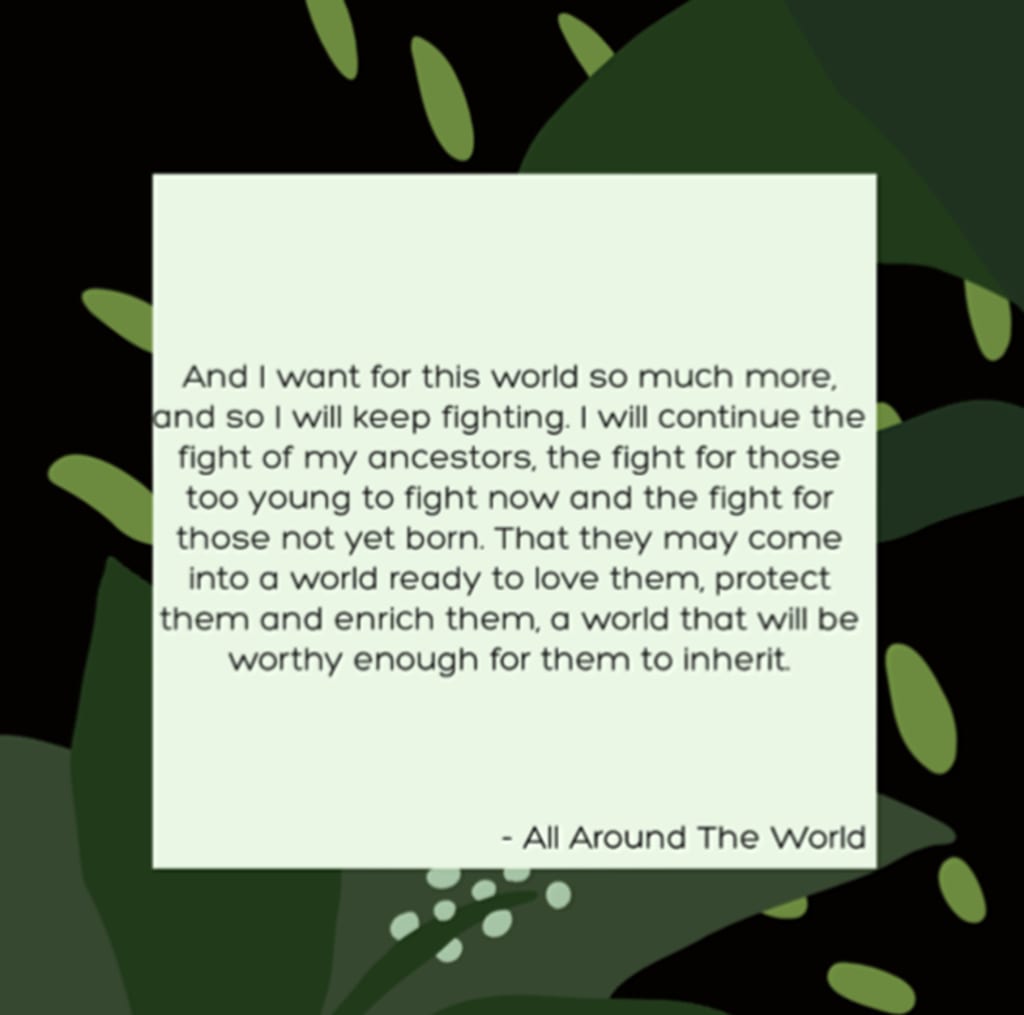I yearn to see a world enshrined in equality and peace for all. And I want for this world so much more, and so I will keep fighting. I will continue the fight of my ancestors, the fight for those too young to fight now and the fight for those not yet born. So that they may come into a world ready to love them, protect them, enrich them and a world worthy enough for them to inherit.