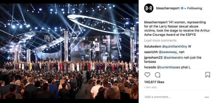 Bleacher Report's Instagram post from the ESPYS, with over 140,000 likes.