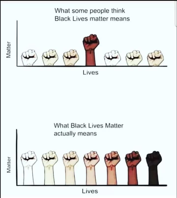 Black Lives Matter simply means that the lives of Black people are important. It does not mean that Black people are more important than others. It serves as a reminder that they are important. If you feel that Black Lives Matter is an unfair statement remove the invisible “only” from the beginning of the statement and add an invisible “also” to the end (Only Black Lives Matter versus Black Lives Matter Also). Here is a chart to help explain this further.