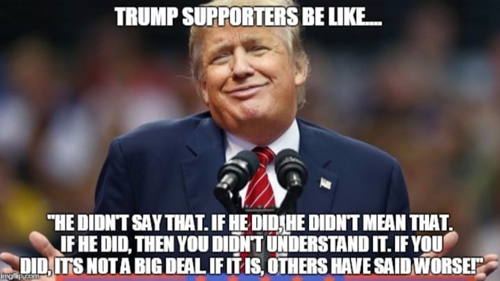 A huge percentage of Trump supporters say that they don't care about the character as much as they care about the issues. And if they see that he cares about the issues they care about, even doing something about it, then they are going to accept that he may be flawed. Hence the whole "Trump Supporters be like" meme: