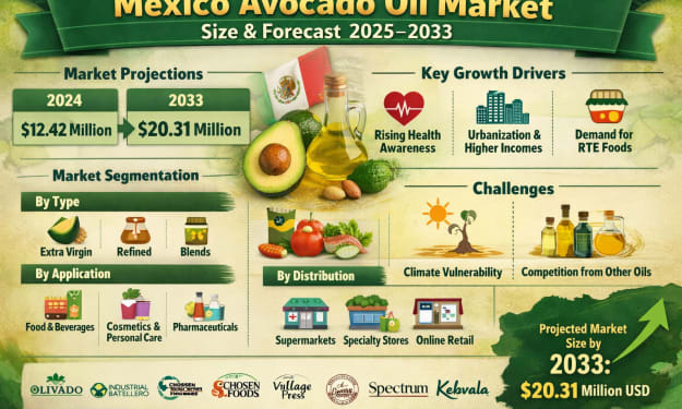 Mexico Avocado Oil Market Outlook The Mexico Avocado Oil Market is expected to reach US$ 20.31 million by 2033, growing from US$ 12.42 million in 2024, at a CAGR of 5.62% from 2025 to 2033. This steady growth reflects the country’s unique position as the world’s largest avocado producer and the rising global and domestic appetite for healthier, plant-based oils.